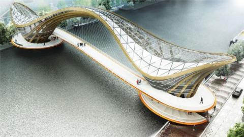Architect Laurent Saint-Val seeks to reclaim the forgotten wooden medium and showcase it in his modern bridge proposal. The extravagant design of the bridge imitates the flow of running water. The bridge differs from most in that it features a restaurant, bike shop and garden... Beautiful Facet:  DYNAMISM