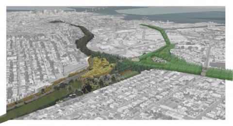 A 30-acre site of underutilized space located beneath a multi-level interchange in San Francisco, CA is envisioned as a highly productive sequestering urban forest that humanizes the street level making it accessible, safe, and enjoyable for the public. The design had three primary goals. 1) Combine time, process, and ecology to offset CO2 emissions from the freeway while creating a memorable place. 2) Reduce persistent flooding on this former marshland. 3) Reconnect 2 neighborhoods to each other and to the city’s largest Farmer’s Market... Beautiful Facet: NATURE